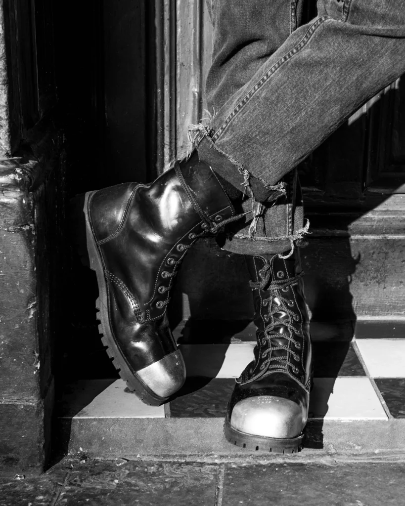 With the growth of heavy industry, thick-soled boots with reinforced toecaps were needed. The leather boots provided protection to the feet of workers and were needed in Britain’s factories and foundries. The leather boot also became the choice of footwear of the British army. Steel cap boots – with their metal cap exposed, or concealed beneath the leather upper, became the footwear of the British working-class male. Skinheads began to emerge as a youth movement in the early 1960s. Their working-class roots were reflected in their adoption of the “Steel Cap. By the 80’s, Skinhead style became synonymous with football terrace hooliganism and violence. The decade approached its anarchic close, steel caps were favoured by Punks and their nihilism was matched by ferocious creativity.