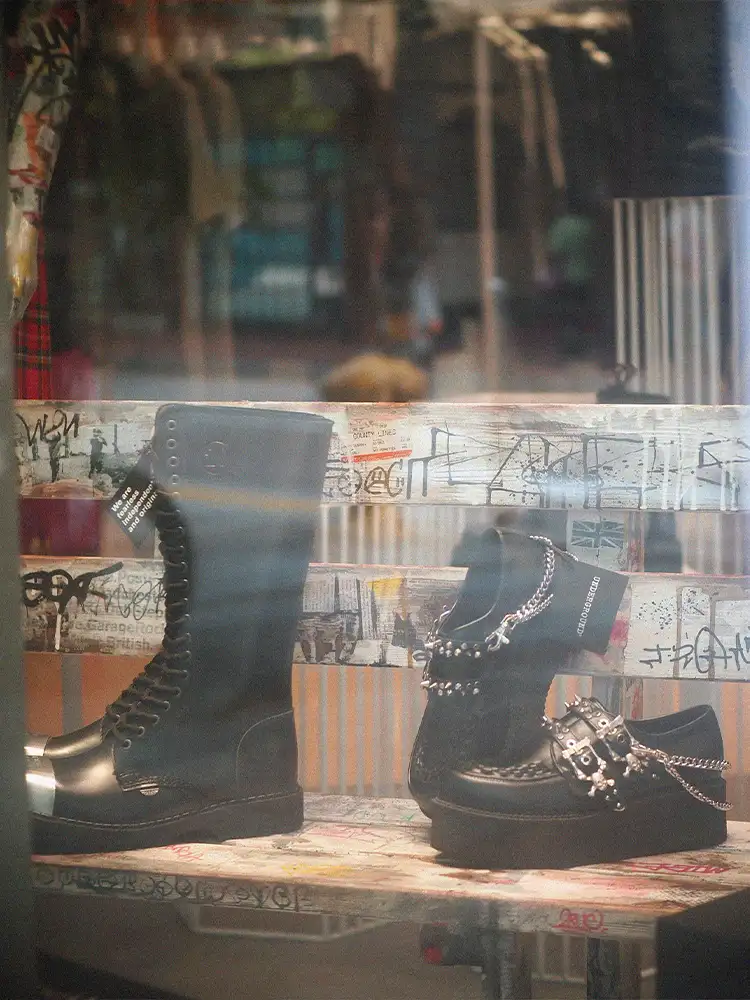 At the front window, a bench covered in graffiti and stickers becomes the centrepiece. It’s more than a prop – it’s a snapshot of the London pavement, layered with attitude and rebellion, a backdrop for our footwear. Alongside it, a mannequin styled in Underground clothing and accessories stands as our punk icon, representing the spirit that refuses to conform.