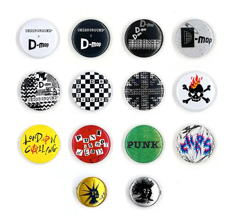 A premium button badge set celebrating punk heritage — sharp graphics, bold slogans, and rebellious spirit, crafted for true subculture devotees.